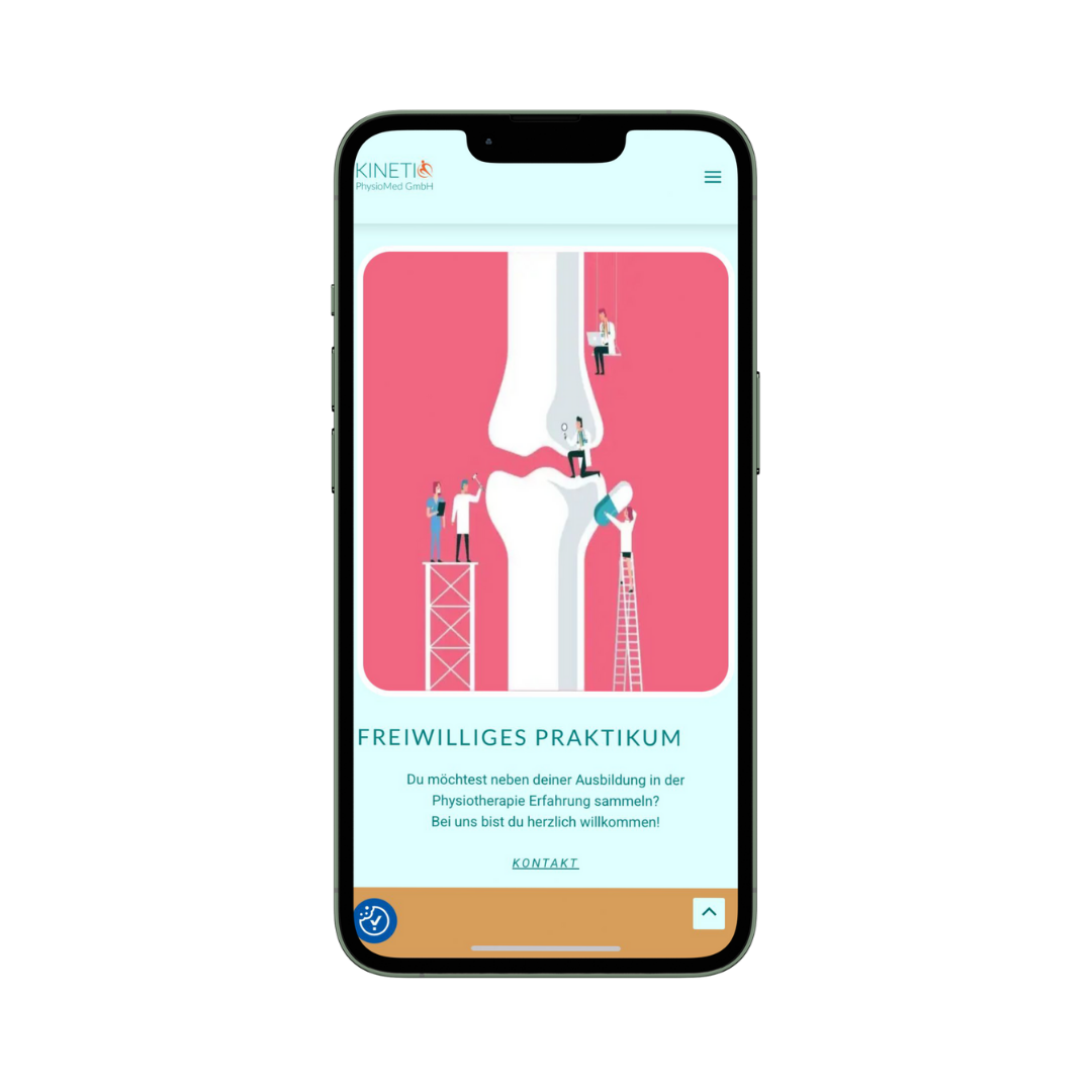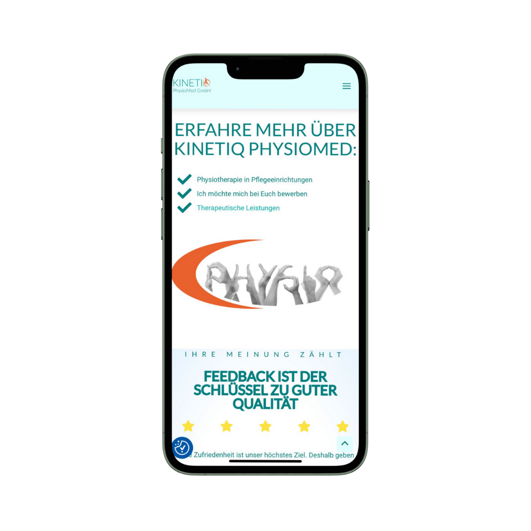 Die mobile Version der Kinetiq PhysioMed Website wurde speziell für Smartphones und Tablets optimiert. Mit einem responsiven Design sorgt sie für eine nahtlose Benutzererfahrung auf allen Geräten und maximiert die Conversion-Rate bei mobilen Nutzern.
